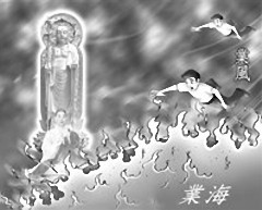 我心知大事不妙,但已來不及思考,當下只感到四處一片黑暗,同時雙腳變得虛軟無力,飄飄然地離開地面,隨即一陣陰冷的業風從背後襲襲吹來,強而有力地將我向前吹去。此時,我眼前忽然現出一座城,城門上冒著熊熊烈火,如同千萬隻繾綣糾纏的毒蛇,憤怒挑釁地噴吐著火紅的舌信,顯得恐怖異常,但在茫然無邊的黑暗中,那是唯一能見的光,在自然反應之下,我就像一個無主遊魂,一直朝著那光向前飄去,愈飄愈近,愈覺得熾熱難耐,我已警覺到應該趁早回頭,但那陣陰風不斷將我吹向火城,我雖想停下,卻力不從心。