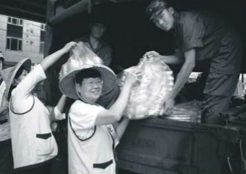 廿五日風雨暫歇,地皎恩師除親自電話關懷三重地區的信眾,更指示成立關懷中心,動員大批常住師父和義工居士準備了數百個慈心便當,趕在第一時間送往三重市公所防災中心,以紓解水患之困;許多受災民眾乘坐橡皮艇前來領取便當,基金會也特別將便當送至正在同安抽水站搶救工程的軍方官兵。風雨中,吃著基金會供應的慈心便當裹腹,備感無情風雨後的溫馨。
