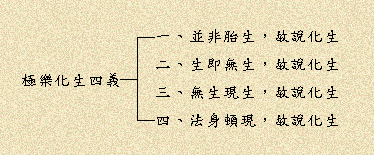 第四,法身頓現,故說化生── 往生極樂,正覺花生,不藉修斷,法身頓現。如世化生,無而忽有,內外具足,無有缺少。(560)