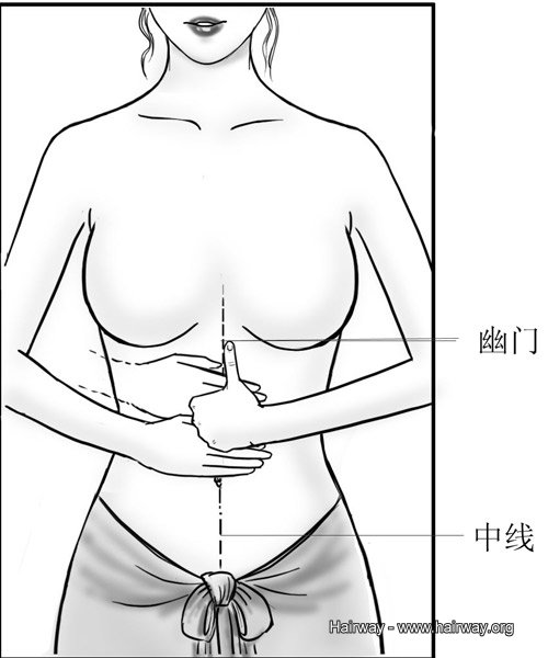腎經是從下肢循行到胸腹部的,在上半身有很多穴位。她從胸骨摸下去,第一個穴位俞府就很痛,再往下邊摸邊按,胸口下的步廊穴、幽門穴都很脹痛。就在這些痛的地方,她連續揉了兩天後,胸悶開始減輕,胸口下面的部位也沒有那麼脹痛了。