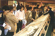 ◇公元二○○四年十一月十三日至二十日 首展地獄變相圖原作及觀音勢至菩薩佛像、二祖安心圖、問道藥山禪師、孔子六藝圖、孔子問禮於老子、龍馬圖及地藏菩薩像。展出期間人潮不斷,每日觀者數千人,讓日本觀眾歎為希有。 |