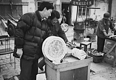 ▲伍宗文博士在路邊買「大如鍋蓋」的麵餅。