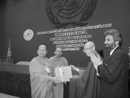 為什麼我會被大會指定代表主席團,向與會宗教領袖贈送紀念品,這可能有兩個原因:(1)我沒有機會單獨主持任何一場會議,所以把最後一項光榮的任務交給了我。(2)這回大會贈送的紀念品,是水晶所製鑽石型的一個配有聯合國地球儀圖案的大會標誌,是用高科技的雷射工法製成,從哪個方向看,圖形和文字都是透明立體的,本來只訂製一百個,當他們看到樣品之後,又追加了一百個;這是由我們法鼓山的信徒,在短時間內多方奔走接洽完成的。特別是大會贈送皇太子和朱拉隆功大學校長的紀念品,都是由我們法鼓山信眾提供由王俠軍所製作的琉璃藝術品,不論誰看了都讚不絕口,精緻、高雅、大方,雖然沒有印上是由台灣製作,但頒贈這項禮物的任務就交給了我。結果在大會圓滿畫下句點之時,我好像成了受到大眾歡迎的聖誕老人,不僅僅是這份禮物,還有為朱拉隆功大學準備的一份禮物,也交給我分送了。