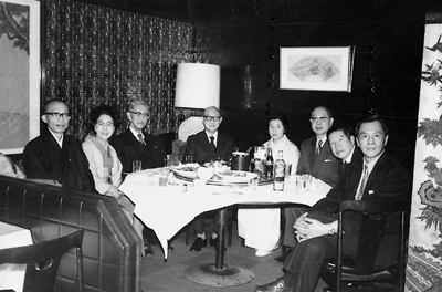 ▲作者(左一)獲得博士學位後,由其僅有的兩位皈依弟子毛慶藩(右二)、鈕南雷(右一)設素筵為作者謝師。出席者為論文主審教授,茂田井教亨(左四)以及正副指導教授金倉圓照博士夫婦(左三、左二)、野村耀昌夫婦(右三、右四)。