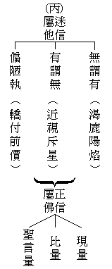 「聖言量」,佛說的話,就中國聖人來講,孔夫子講的話,那個當然是可靠的,因為聖人不跟我們凡夫一樣。我們凡夫說話免不了還有所企圖、有所貪名圖利,既是有貪名圖利在那裡,他說話有所隱瞞的,有些不可靠。聖人不會貪名圖利的,他講的話都是真實的話,所以我們相信聖人的話,以聖人的話做一個標準,這叫聖言量。因此我們學佛,你拿佛所講的話、經裡面講的話,這是可靠。儒家,像中國講五經,經裡講的話都是可靠的,這都是聖人的話。這都是信得過的,現量可以相信、比量可以相信、聖言量可以相信,這不是迷信,這是正信。