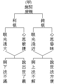眾生根機,由宿生栽培之淺深不同,致今生修學之利鈍乃異。其鈍根者,心思昏昧,有聞亦多不解;且眼光淺近,只圖當前利害;故惟可為說「世間法」,先作方便接引;若與上等法,將無法接受,所謂中人以下,不可與語上也。其利根者。心思敏捷,或聞一以知十;且眼光遠大,兼顧過未因果,則須為說「出世間法」,直令究竟度脫;若與下等法,則必不滿其意,所謂中人以上,可與語上也。如是應病與藥,契機施度,故或種(令種善根)或熟(令善根成熟)或脫(令究竟解脫),一一皆無空過者也。