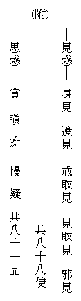 聲聞乘者,譬如校制之小學;因聞佛之聲教,明了苦空無常道理,修「四諦」法,斷見思惑,而證阿羅漢果,故曰聲聞乘。見思惑者,三界內生死根本,分見惑與思惑;見惑,又名見所斷惑,是迷理(諦理)之惑,以見道時,見真諦理,能斷此惑;思惑,又名修所斷惑,是迷事(事境)之惑,須修道位中,重慮緣真,方斷此惑。詳分見惑有八十八使、思惑有八十一品;見惑八十八使,是約十使對三界四諦而論;思惑八十一品,是約貪瞋癡慢對三界九地而論(欲知詳細品目,可參天臺四教儀註彙補輔弘記)。今且略釋「十使」名義,以助心觀:(一)身見:五蘊非我,計我我所。(二)邊見:於五蘊身,執斷執常。(三)戒取見:無益苦行,非因計因。(四)見取見:外道得益,非果計果。(五)邪見:不信三寶,撥無因果。此五執見曰五利使,以惑性銳利,遇境輒生分別,且時刻有之,故曰利使。(六)貪:心於順境,而生貪著。(七)瞋:心於逆境,而生瞋恚。(八)癡:諸法事理,心不明了。(九)慢:恃已本領,輕淩他人。(十)疑:諸法事理,心不決定。後五種名曰五鈍使,以惑性較鈍,由推前利使而生,如於順己五見上起貪著、於違已五見上起瞋恚等,故曰鈍使。阿羅漢者,聲聞乘之極果,含有三義:(一)殺賊義,破身口諸惡,殺盡見思煩惱賊;(二)應供義,斷惑道高,堪受人天供養;(三)無生義,永入涅槃,不復分段生死。須知聲聞之人,但期出苦,為自了漢,無化他志,故為小乘。