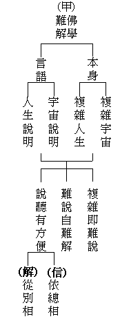 佛學深廣,因所公認。然非佛學故弄玄虛,而唱高調。原來佛學本身,即是複雜之宇宙,與複雜之人生。此在世間一般之科哲、宗教、學術等,只是作虛妄分別,皆不能以澈底。唯佛以一切種智(佛的智慧,又稱「大圓鏡智」)圓澈照見,故能無一物不知,無一事不曉。然後用文字般若(語言文字)演說宇宙狀況、人生實際,來覺悟一切眾生。但是,內容複雜則必言語難說,說既難說,聽必難解,這是自然的道理。