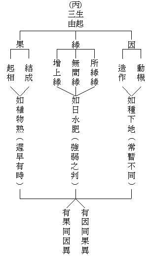 再說「果」:果即結果,指生成之一切現象。因緣和合,則能生成一切萬法,如植物熟,故名曰果。