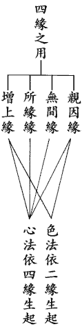 次說「緣」:緣是助緣。譬如:只有稻種,不能生果,必須加上土地、水分、日光、肥料等之幫助,然後才能長出稻來。此土地、水分、日光、肥料等,即是助緣。唯識論上,論生起萬法之緣有四(如表),略釋於後:
