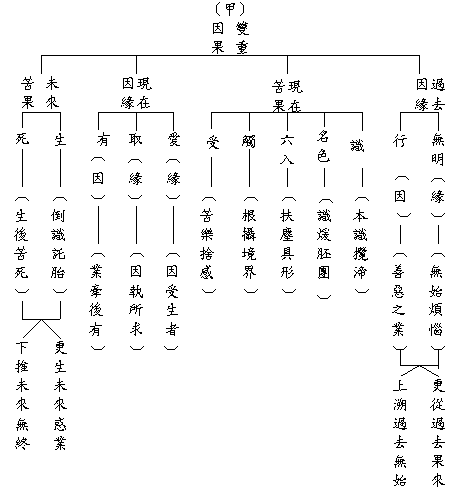 如上所說,十二支包括過去因緣(無明、行二支),現在苦果(識、名色、六入、觸、受等五支),現在因緣(愛、取、有等三支),未來苦果(生、老死等二支)。是為雙重因果,此乃佛陀說明吾人生死相續之一種鐵則。