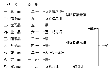 古人為了容易記憶品名,造有一偈:「界二根五世間五,業六隨三賢聖四,智二定二破我一,是名俱舍三十卷」。